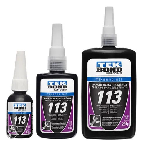 El adhesivo anaeróbico Tekbond 113 es un sellador de roscas químico de bajo par (bajo torque) diseñado para bloquear y fijar pernos, tornillos y tuercas de pequeño y mediano porte, evitando que se aflojen por vibraciones, choques o esfuerzos dinámicos. Formulado para curar en ausencia de aire cuando se encuentra entre las superficies metálicas (entre rosca y rosca), este producto promueve una unión fiable, mejora la sujeción y protege contra la corrosión y fugas en conexiones mecánicas. El Tekbond 113 tiene viscosidad entre 1.000 y 1.600 cP, temperatura de trabajo desde −60 °C hasta +150 °C, y curado inicial en ≤ 20 min con curado total en 24 h, lo que lo hace adecuado para aplicaciones de automotriz, mantenimiento industrial y maquinaria liviana. Esta formulación anaeróbica monocomponente se integra con sistemas mecánicos sin necesidad de mezcla previa, ofreciendo una aplicación sencilla y desempeño confiable para uniones que requieren desmontaje frecuente con herramientas manuales.