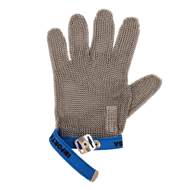 Guante de malla de acero inoxidable STEELPRO certificado, diseñado para brindar protección anticorte de alto nivel en trabajos con cuchillas y herramientas filosas. Su diseño ergonómico y flexible garantiza comodidad, durabilidad y seguridad, ideal para industria alimentaria, carnicerías y procesos de desposte.