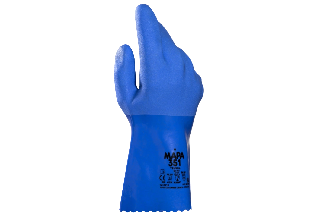 Guante MAPA Telsol 351 de PVC fabricado para protección química tipo A y riesgos mecánicos, con certificaciones EN 388 4121X, EN ISO 374-1 Tipo A, EN ISO 374-5 y EN 420, ideal para mantenimiento en entornos húmedos, industria farmacéutica y limpieza, con gran resistencia a aceites, grasas y hidrocarburos, confort prolongado y agarre firme incluso con superficies resbaladizas.