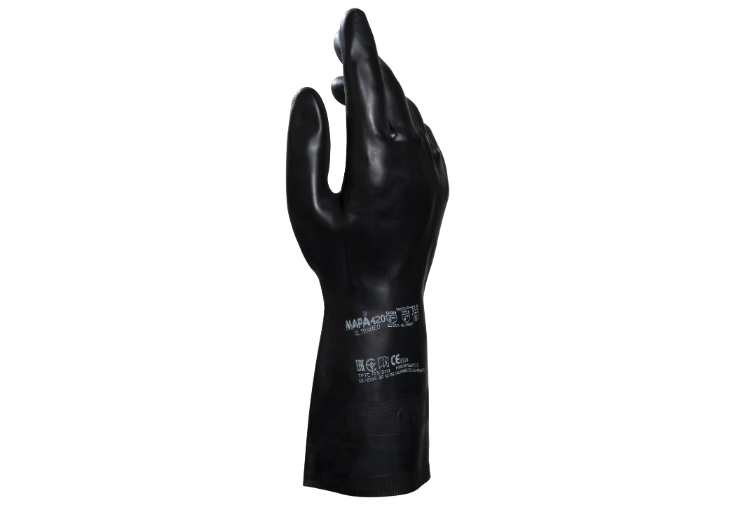 Guante MAPA UltraNeo 420 de neopreno y látex con certificaciones EN ISO 374-1 Tipo A ALMNST, EN ISO 374-5 y EN 388 2121X (Categoría III), diseñado para protección química estándar y riesgos mecánicos, con acabado interior flocado para confort y exterior rugoso para agarre antideslizante en trabajos de industria química, mantenimiento, automotriz y limpieza industrial.
