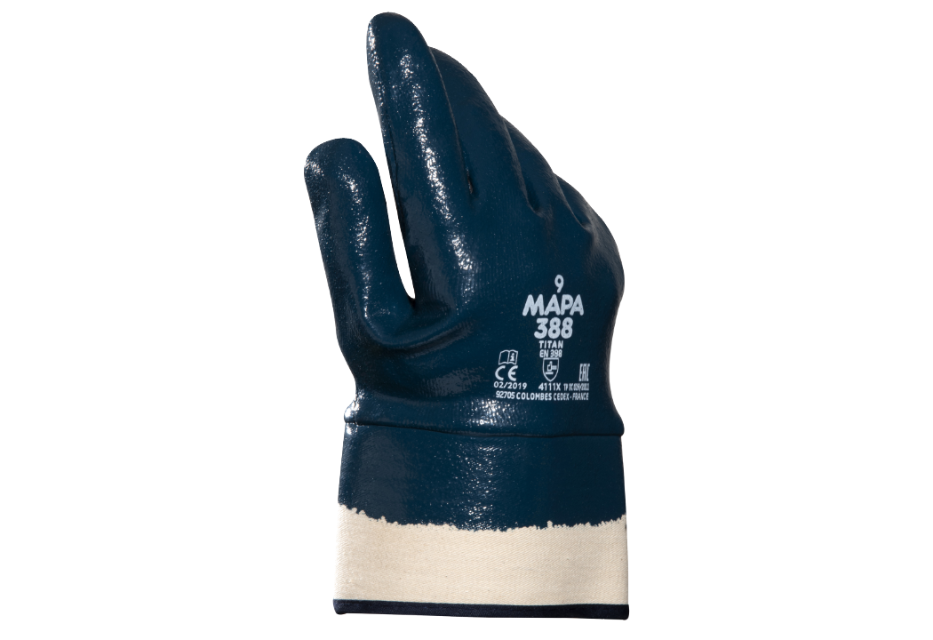 Guante industrial de nitrilo MAPA Titan 388 con soporte textil sin costuras, excelente resistencia a aceites y grasas, diseño sin silicona y grip reforzado para trabajos de manejo pesado y protección en ambientes industriales.