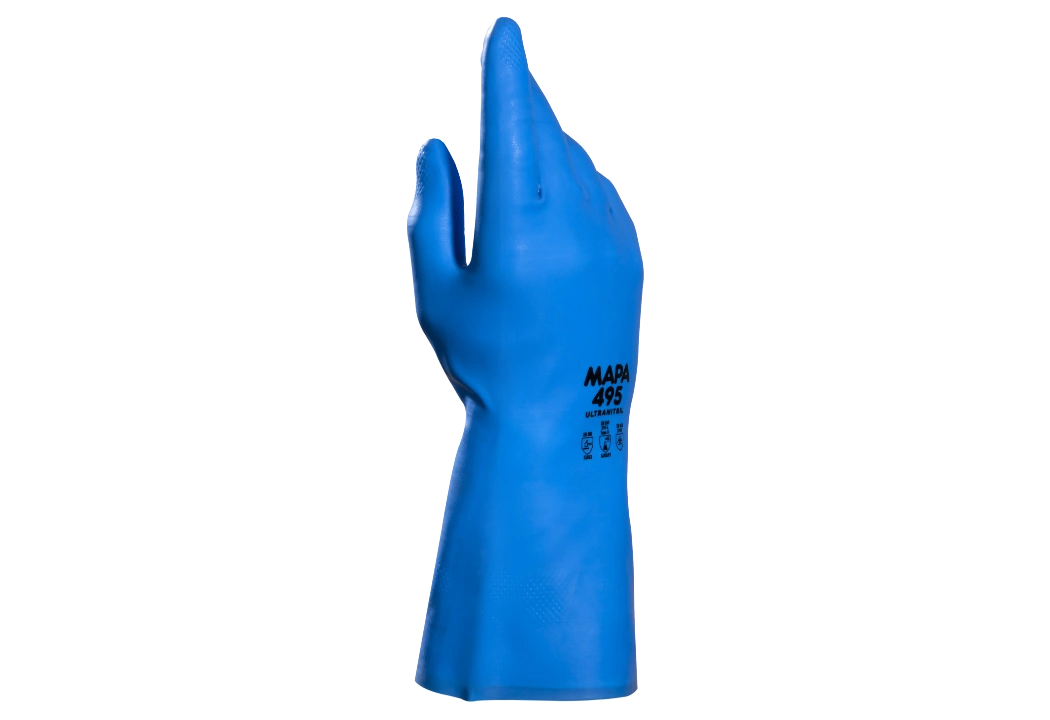 Guante MAPA Ultranitril 495 fabricado en nitrilo resistente con interior flocado y exterior texturado para protección química Tipo A certificada (EN ISO 374-1 AJKOPT), protección contra microorganismos (EN ISO 374-5) y resistencia mecánica EN 388 3101X. Su diseño anatómico ofrece gran destreza, confort y agarre seguro, ideal para industrias alimentarias, manejo de alimentos grasos, mantenimiento y trabajos químicos exigentes. Certificado CE Categoría III para seguridad avanzada.