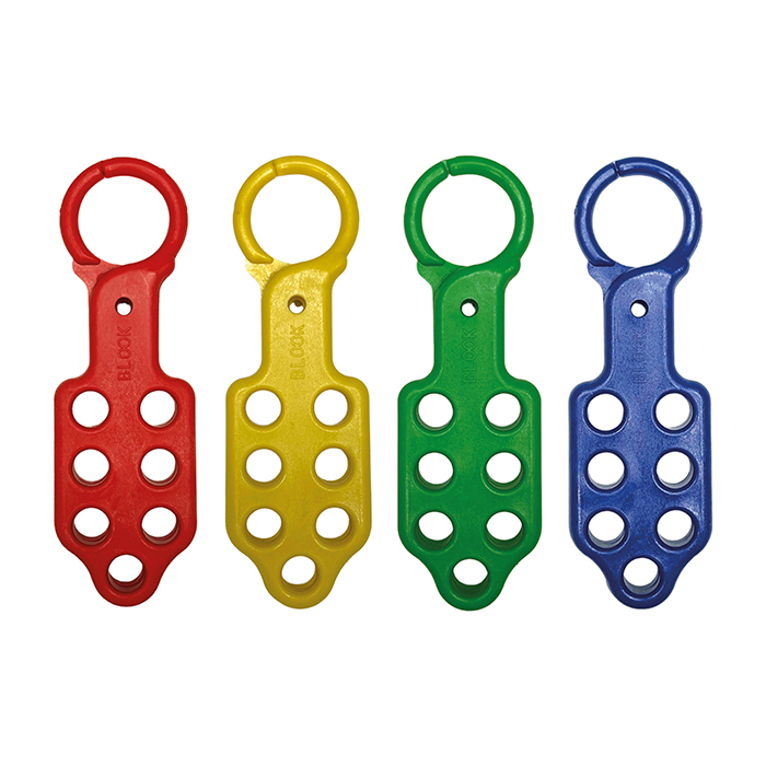 Está fabricado en plástico reforzado con fibra de vidrio, es dieléctrico, liviano y resistente a la corrosión, apto para uso industrial y eléctrico. El color rojo facilita la identificación del punto de bloqueo. Compatible con candados de seguridad estándar de sistemas LOTO.